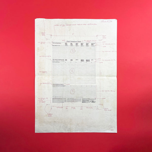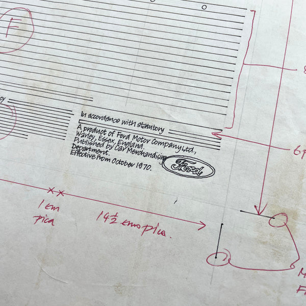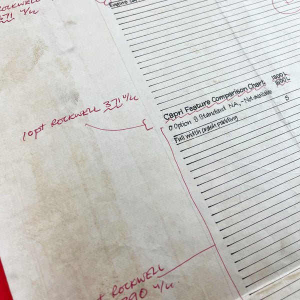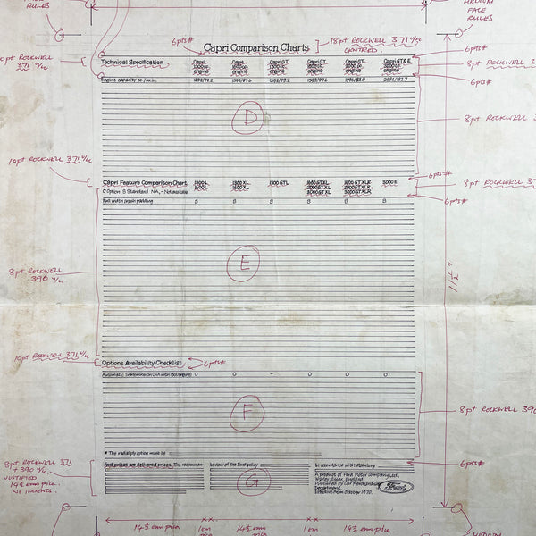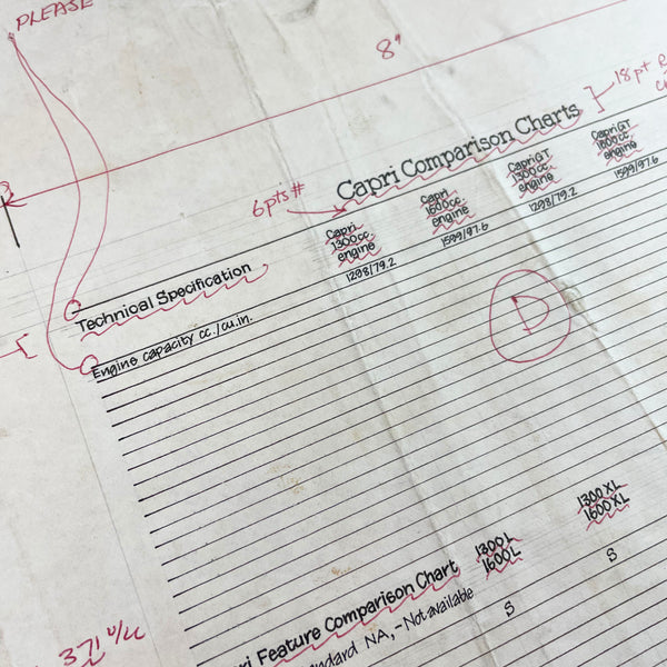 Original pen and ink hand drafted layout for the ‘Capri Comparison Charts' page of a Ford sales brochure.