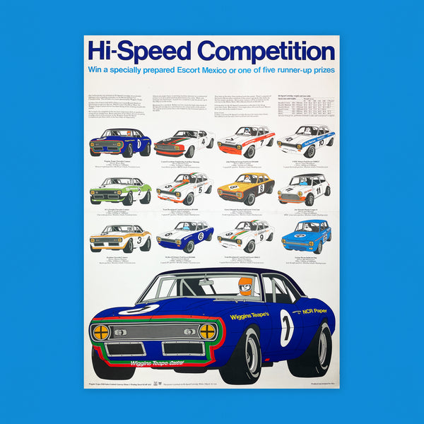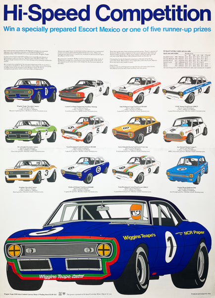 Authentic vintage competition poster for Wiggins Teape. (Text) 'Hi-Speed Competition. Win a specially prepared Escort Mexico or one of five runner-up prizes - Our twelve poster cars printed on Hi-Speed Cartridge are at present fighting it out as leading contenders in the British Saloon Car Championship. This includes two races sponsored by Wiggins Teape. It takes a lot of nerve and skill to fling a car round Brands Hatch or Silverstone at well over the ton. Which is just what Brian Muir, the Wiggins Teape Camaro driver has been doing on his winning rounds this season. We've had a list compiled of the ten most important skills or qualities a racing driver should have. Brian and three of his fellow drivers are going to judge which of the entrants in the Wiggins Teape Hi-Speed Competition put these skills in the best order of importance...'