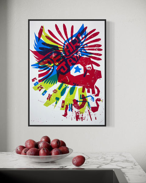 Ames Bros, the Seattle-based design duo of Coby Schultz and Barry Ament (brother of Pearl Jam bassist Jeff Ament), began collaborating with Pearl Jam in the mid-1990s. During the 2000s, they created hundreds of bold, limited-edition screen-printed concert posters, featuring surreal humour and vibrant graphics that have become highly coveted collectibles, chronicled in their 2007 book Pearl Jam vs Ames Bros.