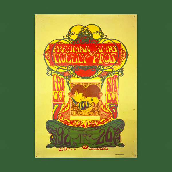 This iconic authentic 1967 vintage poster by Bob Masse advertises Freudian Slips and Tweedy Brothers (2am-6am) at The Ark - a converted old ferryboat nightclub in Sausalito, California - on October 7-8. This rare original printing captures Masse's early psychedelic style during his California period. It's highly prized by 1960s Bay Area rock poster collector.