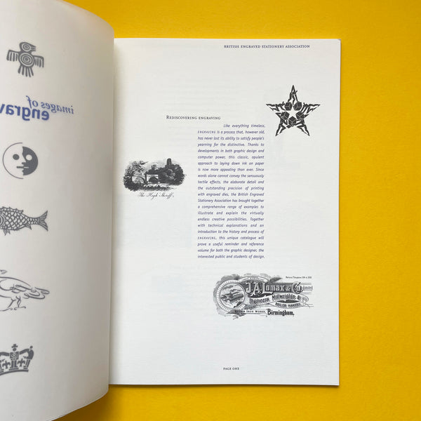 (Introduction) 'Like everything timeless, ENGRAVING is a process that, however old, has never lost its ability to satisfy people's yearning for the distinctive. Thanks to developments in both graphic design and computer power, this classic, opulent approach to laying down ink on paper is now more appealing than ever. Since words alone cannot convey the sensuously tactile effects, the elaborate detail and the outstanding precision of printing with engraved dies, the British Engraved Stationery Association has brought together a comprehensive range of examples to illustrate and explain the virtually endless creative possibilities. Together with technical explanations and an introduction to the history and process of ENGRAVING, this unique catalogue will prove a useful reminder and reference volume for both the graphic designer, the interested public and students of design.'