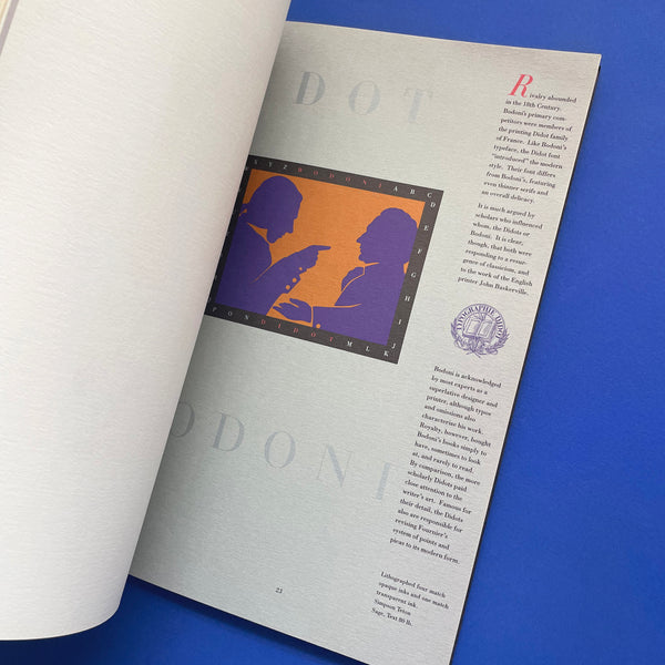 Specimen book featuring the variation of product and finishing qualities of Simpson Paper Company's range of papers. The book itself explores the life and work of Giambattista Bodoni, an 18th-century Italian typographer, type-designer, and printer - showcasing Bodoni's contributions to type design, including the influential Bodoni typeface.