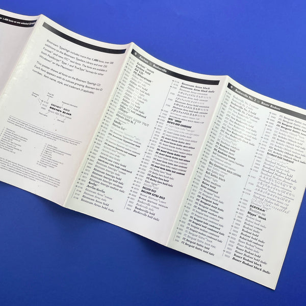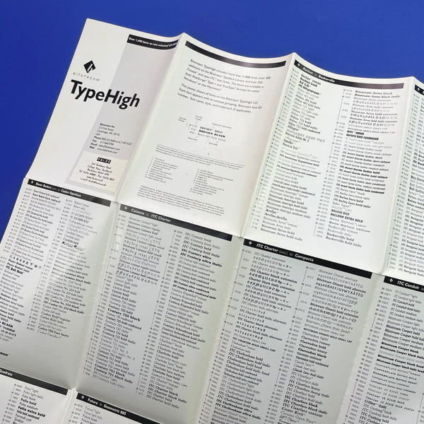 (Preface) 'Bitstream TypeHigh includes more than 1,400 fonts, over 300 additions to the Bitstream Typeface Library and over 250 Fontek® and new ITC® text fonts. The fonts are available in both PostScript® Type I and True Type® formats for either Windows® or the Macintosh®. This poster shows all fonts on the Bitstream TypeHigh CD. Each font appears with its suitcase grouping, Bitstream font ID number, font name, style, and trademark (if applicable).
