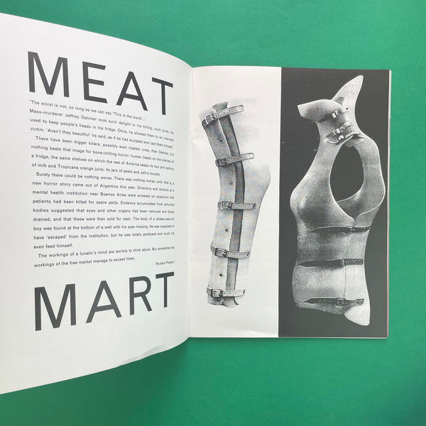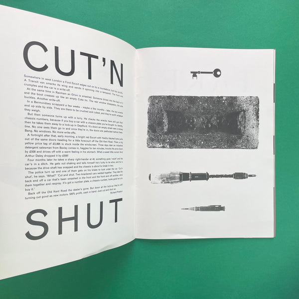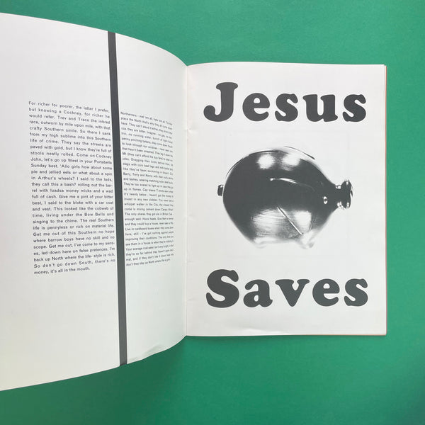 Issue #4 Cash captured the peak of 1990s British rave hedonism and money-worship fever. Fluorescent lime and magenta inks, counterfeit bank-note parodies, layered club-flyer detritus and photocopy degradation celebrated (and satirised) acid-house excess and new-loadsamoney culture. Spreads overflowed with distorted pound signs, Ecstasy pills rendered as currency and shredded stock-market listings. Widely considered the loudest, most fluorescent and most cynical of the series, Cash pre-figured the bling and Y2K aesthetics that dominated design five years later.