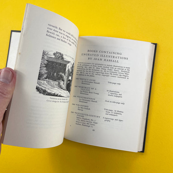 (Introduction) 'Joan Hassall lives and works in the house in which she was born, a large Victorian terrace house in Notting Hill, which was also the home of her father, the famous poster artist, John Hassall. A studio had been built out at the back of the house in the 1890's, occupying the whole garden, with a glass roof and high side-windows. When he died in 1948 the room had not been cleared for upwards of forty years. It contained a fantastic accumulation, for Hassall would throw nothing away which interested or amused him and seems to have had a wide circle of globe-travelling friends and family who always returned with presents to add to the collection. Surviving photographs show the artist at his easel against a grotto-like background which includes early posters, statuettes, curios, masks, weapons, costumes, the ceremonial head-dress of a Red Indian chief, suits of armour, and an Elizabethan four-poster bed. What looks like an ivy-covered wall turns out to be a collection of flags on pins from 1914-1918 Flag Days, when that ingenious method of raising money from the public started...'