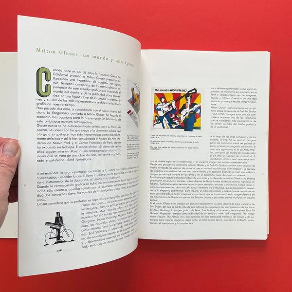 Catalog to coincide with a significant exhibition of American graphic designer Milton Glaser's work held in Barcelona, Spain, at the Saló del Tinell (Tinell Hall) from October 20 to November 26, 1989 - showcasing his influential designs, posters, and logos, highlighting his global impact on visual communication during that era.
