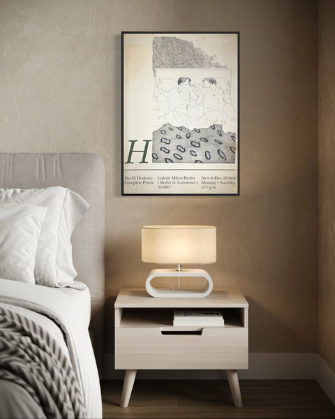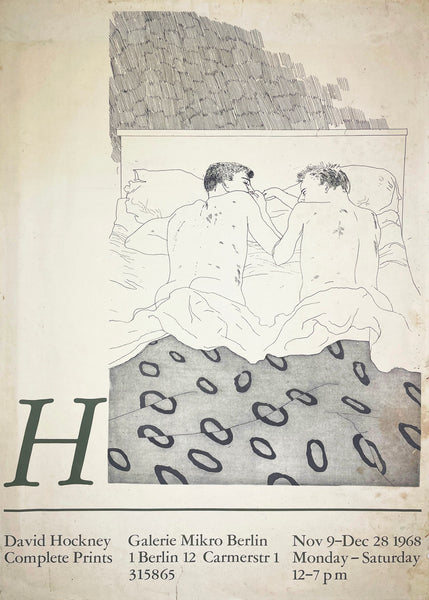 Poster advertising a David Hockney exhibition titled "Complete Prints" at the Galerie Mikro in Berlin, which ran from November 9 to December 28, 1968. The poster features an image of one of Hockney's well-known etchings from 1966, titled Two Boys Aged 23 or 24, which was part of his series Illustrations for Fourteen Poems by C.P. Cavafy.
