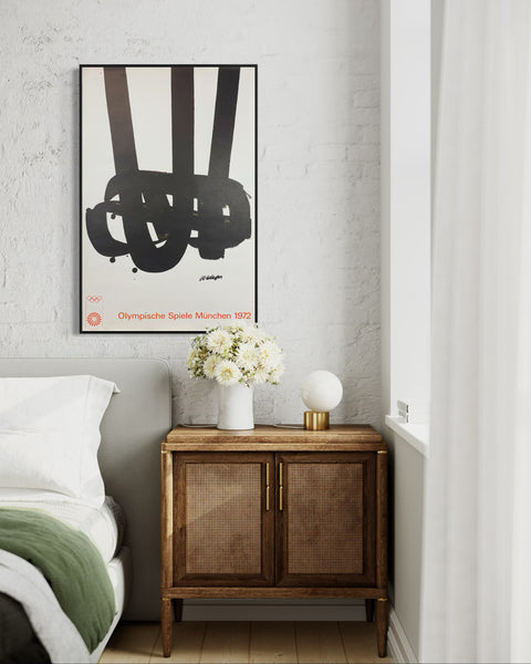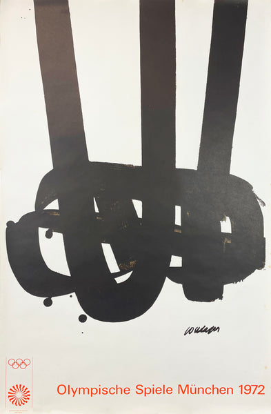 This poster is one of the official designs for the 1972 Summer Olympics held in Munich, West Germany, from August 26 to September 10, 1972, created by the renowned French artist Pierre Soulages (1919–2022). Part of the Munich Organising Committee's prestigious "Artist Series" (24 posters by 29 international artists), it was overseen by graphic designer Otl Aicher and reflects the Games' theme of cultural renewal and peace.