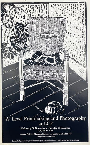 This poster advertises an "A' Level Printmaking and Photography" exhibition at London College of Printing, held from 30 November to 15 December. It features a striking black-and-white linocut-style illustration of a wicker chair with a polka-dotted cushion, a cup, and lush foliage, set against a dark background.
