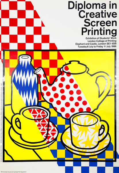This vibrant poster promotes the 1986 Diploma in Creative Screen Printing exhibition at London College of Printing. Featuring bold, geometric designs of a teapot, cups, and a bottle with a red-and-white checkered background, it uses bright yellow, blue, and red hues to create a playful, modernist aesthetic.