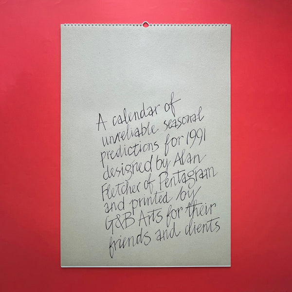 A calendar for 1989 designed by Alan Fletcher for Pentagram and printed by G&B Arts for their friends and clients. Presents unreliable seasonal predictions with witty, experimental layouts and optical or typographic surprises.