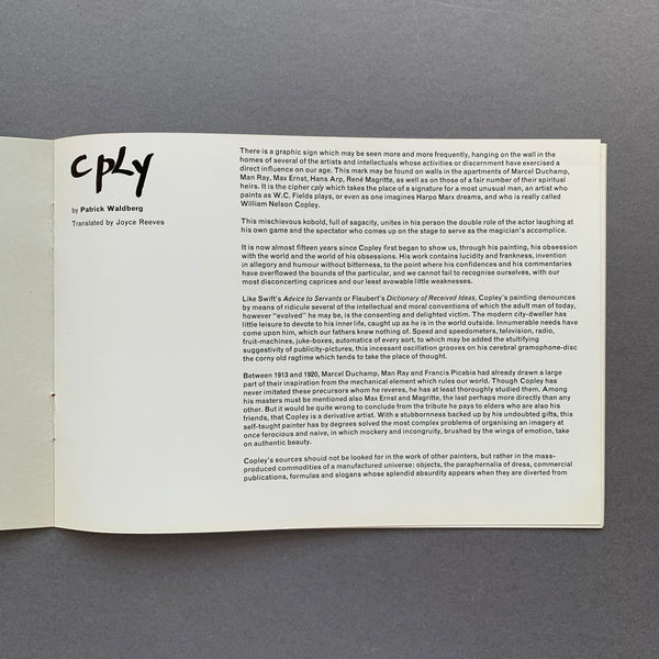 (Introduction) 'There is a graphic sign which may be seen more and more frequently, hanging on the wall in the homes of several of the artists and intellectuals whose activities or discernment have exercised a direct influence on our age. This mark may be found on walls in the apartments of Marcel Duchamp, Man Ray, Max Ernst, Hans Arp, René Magritte, as well as on those of a fair number of their spiritual heirs. It is the cipher ply which takes the place of a signature for a most unusual man, an artist who paints as W.C. Fields plays, or even as one imagines Harpo Marx dreams, and who is really called William Nelson Copley.'