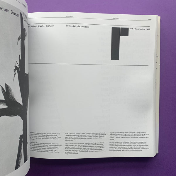 The book is deliberately restricted to pure typography, to working with prefabricated types which are subordinated to a precise system of measurements. Its purpose is to make apparent the inherent laws of typography and - in spite of certain common features - the contrast between it and graphic design which, in both the selection of means and their application, is freer and more complex. It is not the author's aim to "encourage the bad habit of copying" but rather to press home the lesson that good design in printing is based on knowledge, experience and thought. He believes that individual speculation on the final result is less important than knowledge of the way a printed work is constructed and the logical thought which finally produces the typographical design. The book is intended not merely for typographers but also for all those who are interested in contemporary typography.'