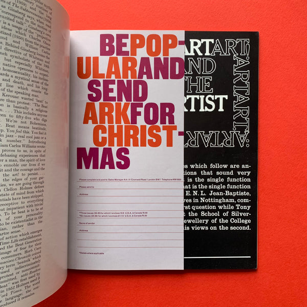 'ARK, a style and design journal created by RCA students, was part of an era of cultural transformation across fashion, film, television, advertising, newspapers and magazines. Such was the stature of ARK that it drew contributions from creative luminaries including Ralph Rumney, Lucio Fontana, Alison and Peter Smithson, Toni del Renzio and Reyner Banham.’ (Source) www.rca.ac.uk
