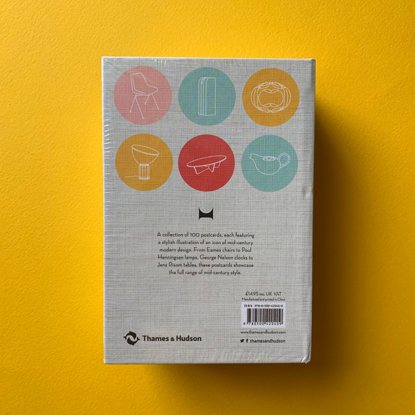 (Publishers overview) 'The mid-twentieth century was one of the most popular, collectable, and dynamic periods of international design. Drawing on the inventive style of the era, this box of 100 postcards features exclusive illustrations of iconic mid century designs, from Eames chairs to Poul Henningsen lamps and George Nelson clocks, all rendered in a distinctive graphic style befitting the era. One hundred postcards depict the best mid-century modern design in the same playful, vintage graphics, with key information about the product on the reverse.'