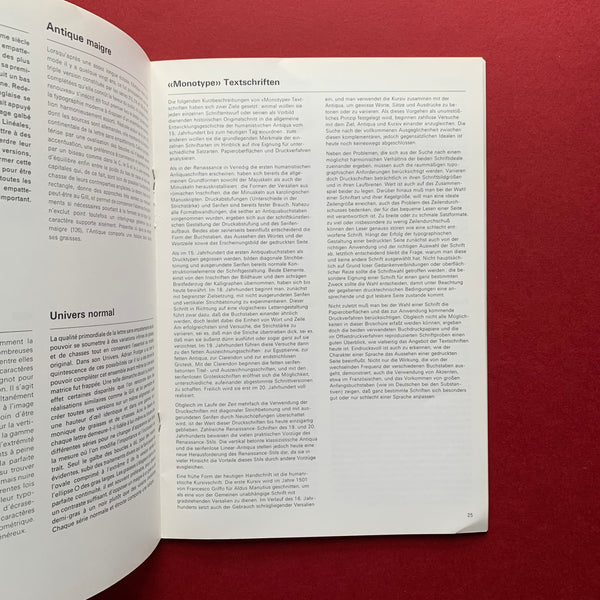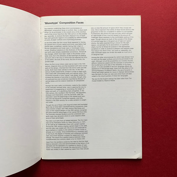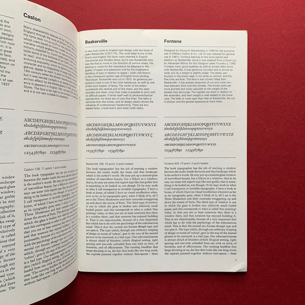 Unlike display type, book lettering should not demand attention, and differences between book faces can be subtle. Monotype compares settings of the same text page in many different book faces.