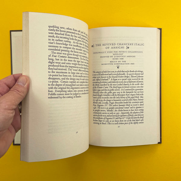 The reasons why the Cambridge University Press was so deeply involved in the typographical burgeoning of those years were recounted in a preface which I wrote for that edition. Stanley Morison became associated with the then Lanston Monotype Corporation in London in 1922 and in the following year Walter Lewis, with whom he had been on close terms for some time, was appointed University Printer at Cambridge. Morison had laid before the managing director of Monotype a plan for the production of an extensive range of type-faces for the firm’s composing machines. He needed the support of a prominent book house to convince the management of the commercial worth of his proposals; he also needed a printer of high quality to do credit to the types produced under his direction. The Cambridge Press under Walter Lewis became an essential ally in his campaign, which was to cause so profound a change in the appearance of books all over the world...'