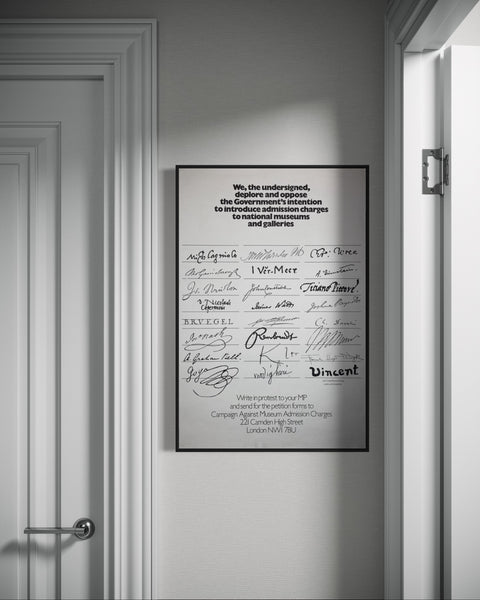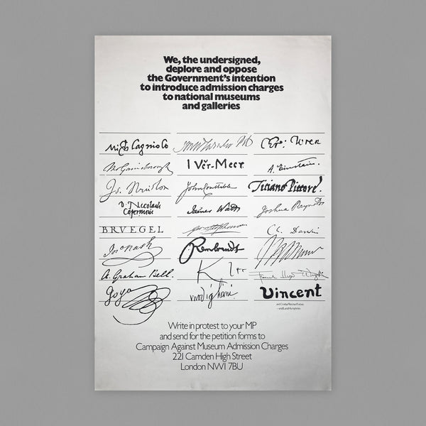 Authentic vintage poster protesting the UK government's proposed introduction of admission fees to national museums and galleries. Titled "We, the undersigned, deplore and oppose the Government's intention to introduce admission charges to national museums and galleries", it was produced as part of a broader campaign to preserve free access to public cultural institutions, reflecting the era's growing cultural activism amid economic pressures and Thatcher-era precursors. A fine example of Crosby/Fletcher/Forbes witty and visually arresting work!