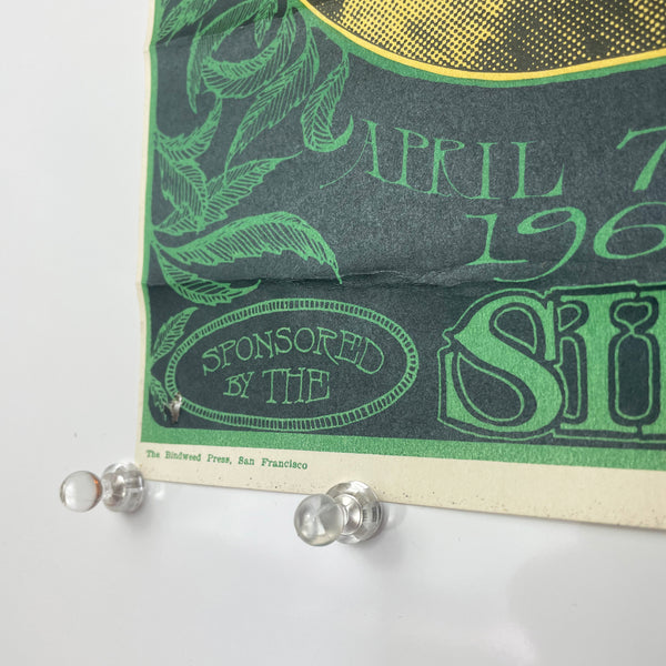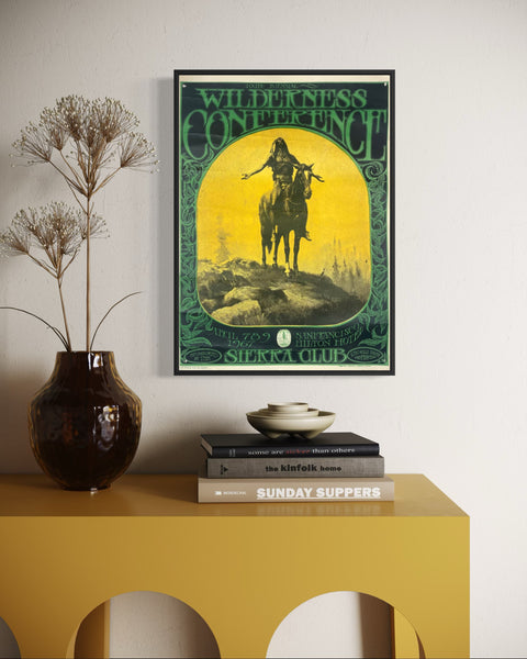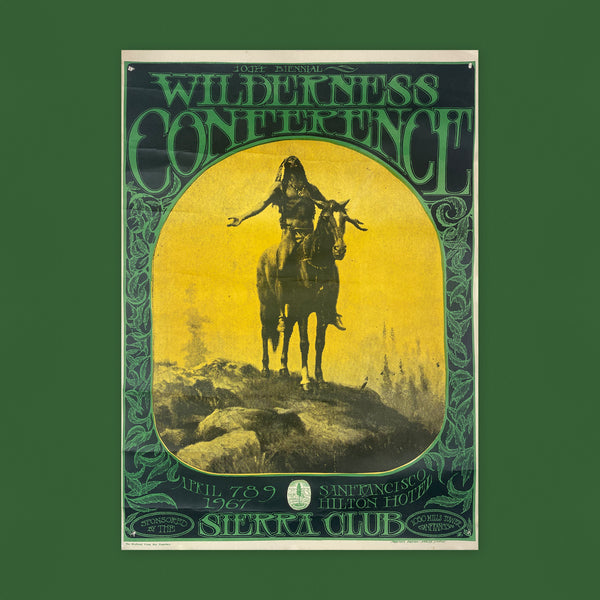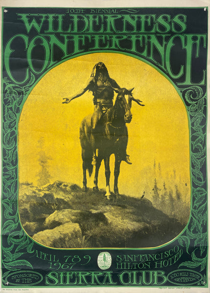 This iconic authentic 1967 vintage poster by Stanley Mouse and Alton Kelley advertises the Sierra Club's 10th Biennial Wilderness Conference, held April 7-9 at San Francisco's Hilton Hotel. This original first printing features vibrant green, black, and yellow inks with a striking Native American warrior on horseback. It's highly prized by psychedelic collectors for its 1960s San Francisco hippie aesthetics and countercultural imagery.