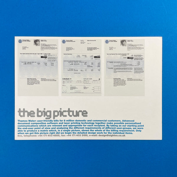 (Item 1) 'Thames Water: user-friendly bills for 8 million domestic and commercial customers. Advanced document composition software and laser printing technology together make possible personalised communications which are relevant and appropriate for each recipient. By taking as our starting point the end-user point of view and analysing the different requirements of different user-groups, we were able to produce a matrix which, shows the whole of the billing requirement. Only when we got this picture right did we begin the detailed work for the individual items.'