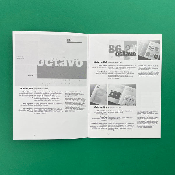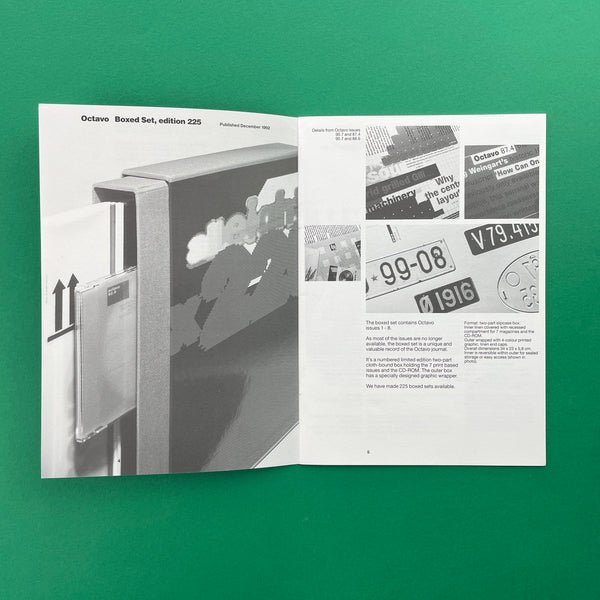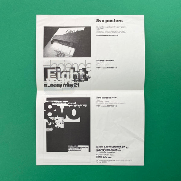 (Text) 'Eight Five Zero Publishing is part of the London based design group 8vo and was initially formed to publish Octavo. As well as Octavo single issues and the boxed set, this first Eight Five Zero catalogue includes a few well known and collectable 8vo designed posters...'