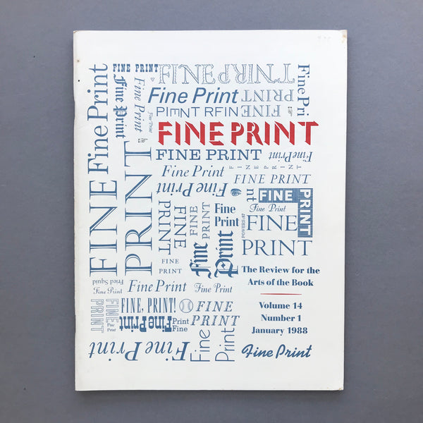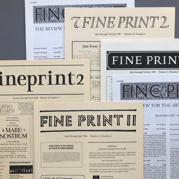 'Started in 1975 in San Francisco as a quarterly publication for the art of the book by Sandra Kirshenbaum. Fine Print covers a variety of subjects including bookbinding, letterpress printing, small presses, artists' books, calligraphy, and hand made paper. Many issues highlight printmaking techniques from around the world. Most editions contain loose inserts of classifieds, news, events, classes, and sometimes prints. These inserts are usually titled "Fine Print II" with different date ranges of coverage but are meant to cover the time elapsed in between issues. Each issue opens to an advertisement from Mohawk Paper Mills describing the paper that each issue is printed on. The papers and oral history transcripts relating to Fine Print are held by The Bancroft Library of the University of California at Berkeley.' (Source) www.centerforbookarts.dreamhosters.com