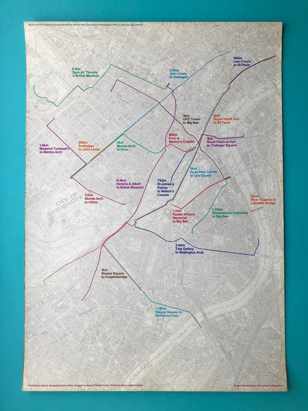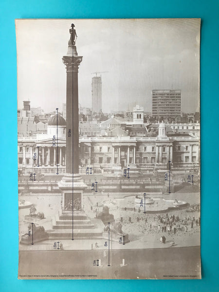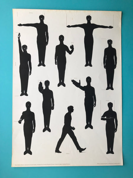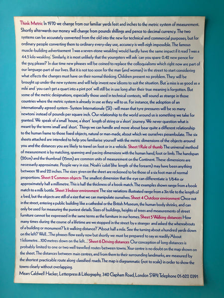 Very scarce complete set of Think Metric posters designed by Crosby/Fletcher/Forbes, based on an idea devised by David Collins. The posters were commissioned to help prepare for the introduction of the metric system of measurement to the UK in 1970, and consist of an introductory poster and six ‘sheets’: The Rule of Thumb, Common Objects, Indoor Environment, Outdoor Environment, Walking Distances, and Driving Distances.