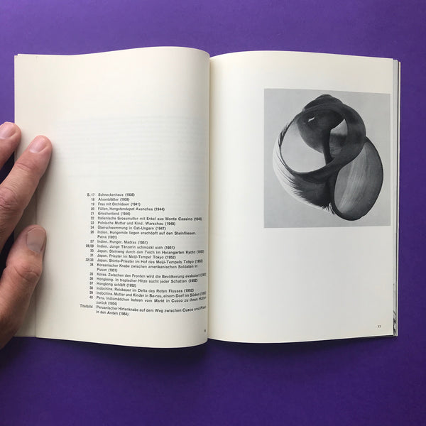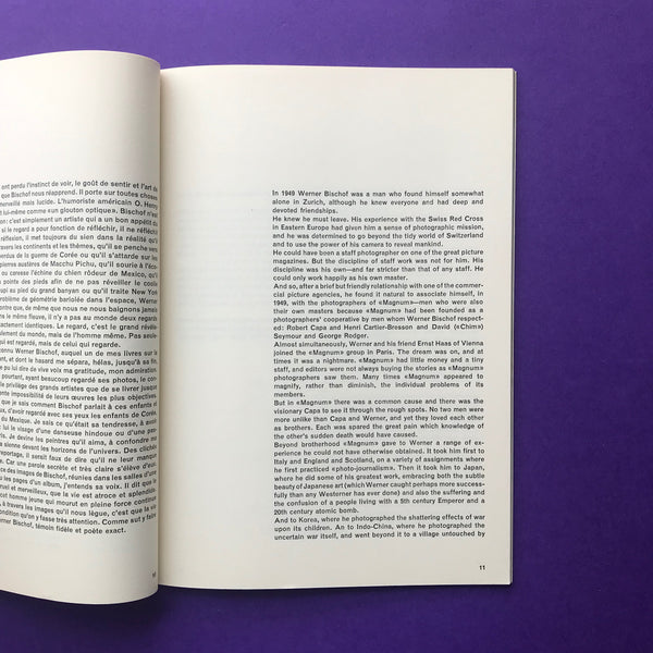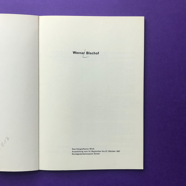 About: 'Werner Bischof - The photographic work, exhibition from September 14 to October 27, 1957'. Designed by the legendary Müller-Brockmann, with text contributions by Hans Fischli, Hans Finsler, Henri Cartier-Bresson, Claude Roy and John G. Morris, with 24 pages of b/w images.