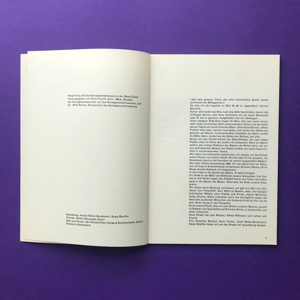 Details: Published by Kunstgewerbemuseum, Zurich. 1957. First edition. Softcover. Perfect bound. 40pp. 210 x 150mm. Printed in black and white, paginated. Text in German, French and English. Designed by Müller-Brockmann.