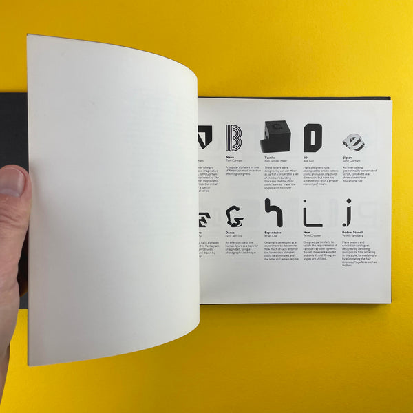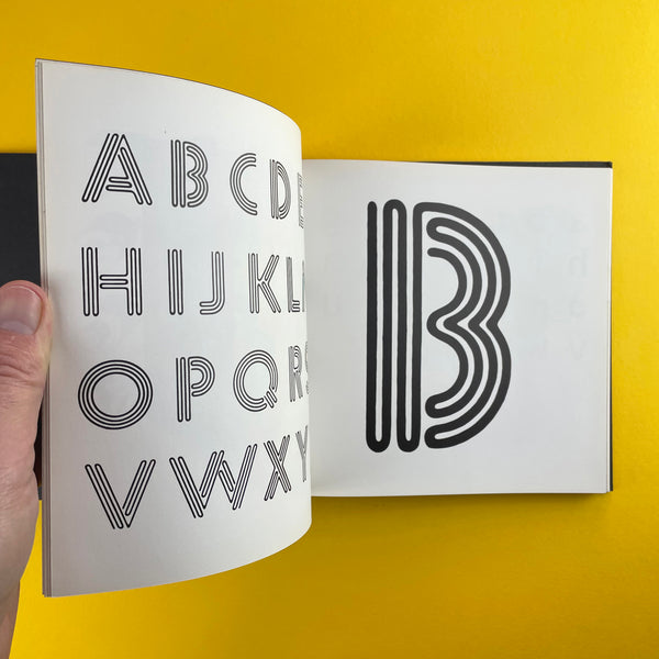 The book contains 38 full alphabets and numerals (66 illustrations, with 5 in colour) designed by a wide variety of cutting-edge typographers of the time; Anthon Beeke, Bentley/Farrell, Derek Birdsall, Tom Carnase, Ivan Chermayeff and Thomas Geismar, Christine Charlton, Alan Clarvis, Brian Coe, Silvio Coppola, Wim Crouwel, Timothy Epps, Alan Fletcher, Alan Fletcher and Mervyn Kurlansky, Bob Gill, Joe Gillespie, David Goodall, John Gorham, Eli Gross, Chris Harrison, Armin Hoffman, George Hoy, Nick Jenkins, Ron van der Meer, Eric Mourier, Wolff Olins, WJHB Sandberg, David Tuhill.'