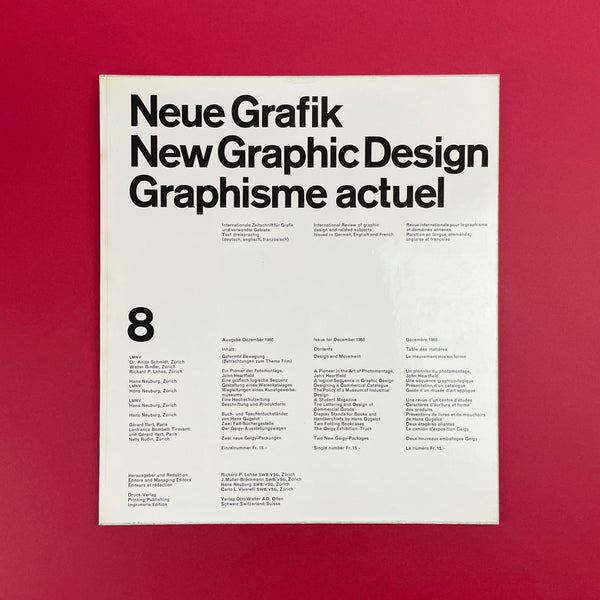Published quarterly in Zürich, Switzerland from 1958-1965, Neue Grafik was arguably the most important journal responsible for disseminating contemporary and historical Swiss functional design ideas and philosophies referred to as the “International Typographic Style”, “Swiss New Typography” or “Objective-Functional Typography”. Edited by like-minded Zurich designers LMNV – Richard Lohse (1902–1988), Josef Müller-Brockmann (1919–1996), Hans Neuburg (1904–1983) and Carlo Vivarelli (1919–1986).