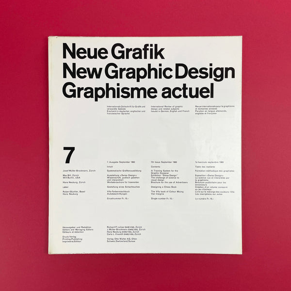 Published quarterly in Zürich, Switzerland from 1958-1965, Neue Grafik was arguably the most important journal responsible for disseminating contemporary and historical Swiss functional design ideas and philosophies referred to as the “International Typographic Style”, “Swiss New Typography” or “Objective-Functional Typography”. Edited by like-minded Zurich designers LMNV – Richard Lohse (1902–1988), Josef Müller-Brockmann (1919–1996), Hans Neuburg (1904–1983) and Carlo Vivarelli (1919–1986).
