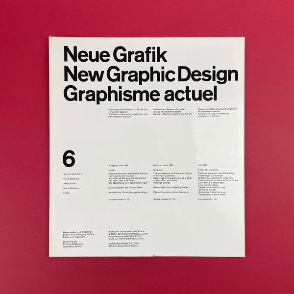 Published quarterly in Zürich, Switzerland from 1958-1965, Neue Grafik was arguably the most important journal responsible for disseminating contemporary and historical Swiss functional design ideas and philosophies referred to as the “International Typographic Style”, “Swiss New Typography” or “Objective-Functional Typography”. Edited by like-minded Zurich designers LMNV – Richard Lohse (1902–1988), Josef Müller-Brockmann (1919–1996), Hans Neuburg (1904–1983) and Carlo Vivarelli (1919–1986).