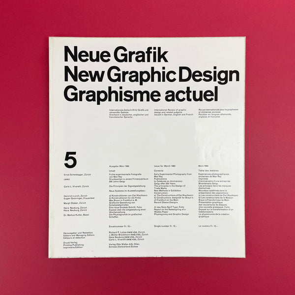 Published quarterly in Zürich, Switzerland from 1958-1965, Neue Grafik was arguably the most important journal responsible for disseminating contemporary and historical Swiss functional design ideas and philosophies referred to as the “International Typographic Style”, “Swiss New Typography” or “Objective-Functional Typography”. Edited by like-minded Zurich designers LMNV – Richard Lohse (1902–1988), Josef Müller-Brockmann (1919–1996), Hans Neuburg (1904–1983) and Carlo Vivarelli (1919–1986).