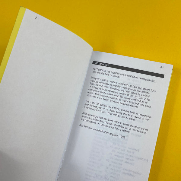 (Introduction) 'FEEDBACK is put together and published by Pentagram for and with the help of their friends. Artists, designers, writers, architects and photographers have a unique advantage in that they belong to an international fraternity. And when travelling to unfamiliar cities, and at a loss as to where to go, are often taken by a friend or colleague to an interesting corner of the city. We asked contributors to restrict their recommendations to major cities, but have also included a few exotic locations as these might prove worth a detour between airports. Although every effort has been made to check the descriptions, names and addresses, changes inevitably occur. We welcome any corrections or comments for future editions.'