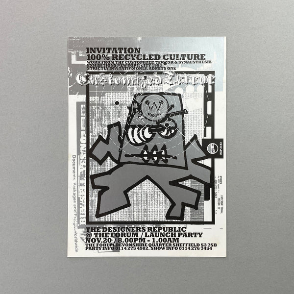 (Text) 'Invitation 100% Recycled Culture - Work from the Customised Terror & Synaesthesia exhibitions New York City 1995. The Designers Republic, The Forum Launch Party, Nov.20/8.00pm - 1.00am, Devonshire Quarter, Sheffield S3 7SB.