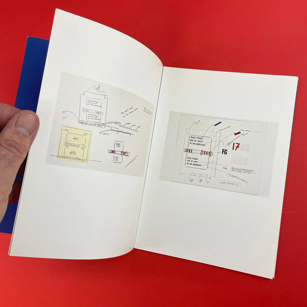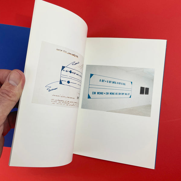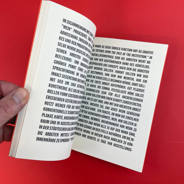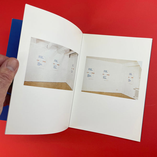 Book presenting the conceptual artist's text-based works — declarative statements evoking themes of revolution, visibility, and hidden symbols. Bilingual elements appear alongside screen-printed flag motifs in blue and red. Weiner contributed to the minimalist design and layout. The book functions as both exhibition documentation and a standalone artist's multiple, exemplifying his use of language and print to address historical and perceptual ideas. It remains a sought-after collectible for enthusiasts of conceptual art, language-based practices, and politically resonant artist's books.