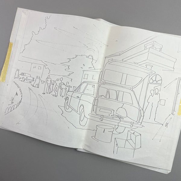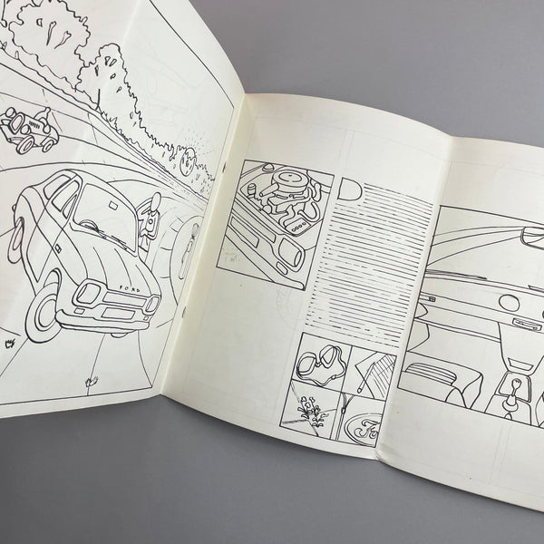 Original pen and ink rough layout dummy for a Ford Escort sales brochure.