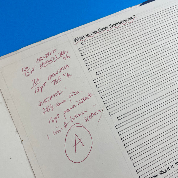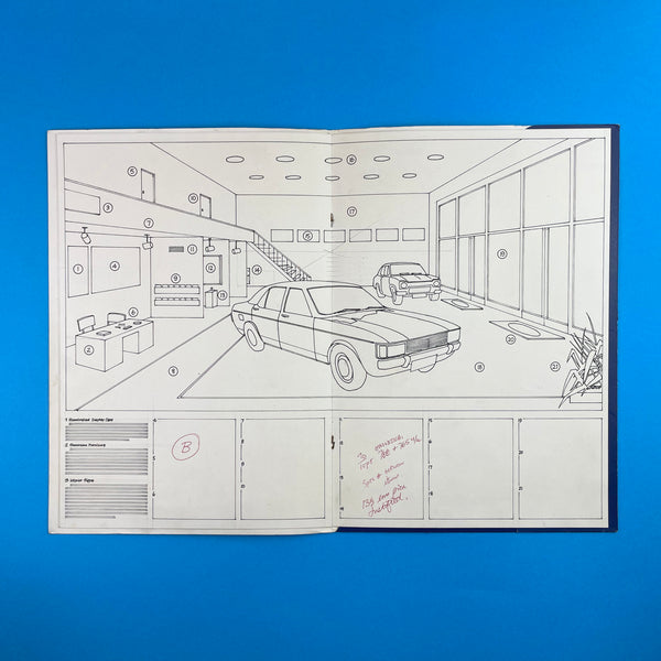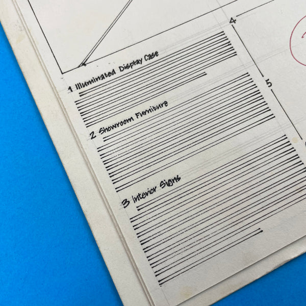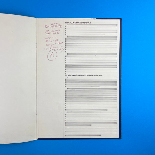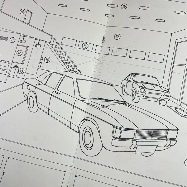 Original pen and ink hand drafted layout for ‘Dealership Development Directory, Car Sales Environment’ brochure.